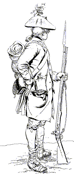 Continental soldier in hunting shirt and overalls, preferred wear for warm weather service. Peter F. Copeland (artist) and Donald W. Holst, Brother Jonathan print series. Courtesy of the artist.
